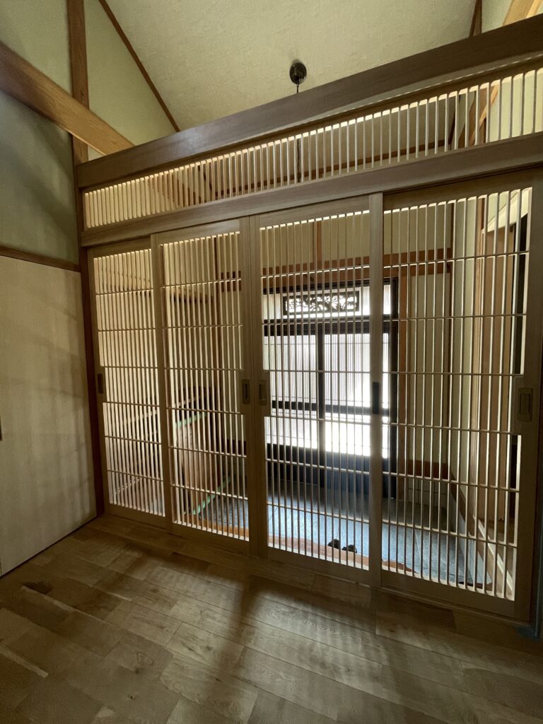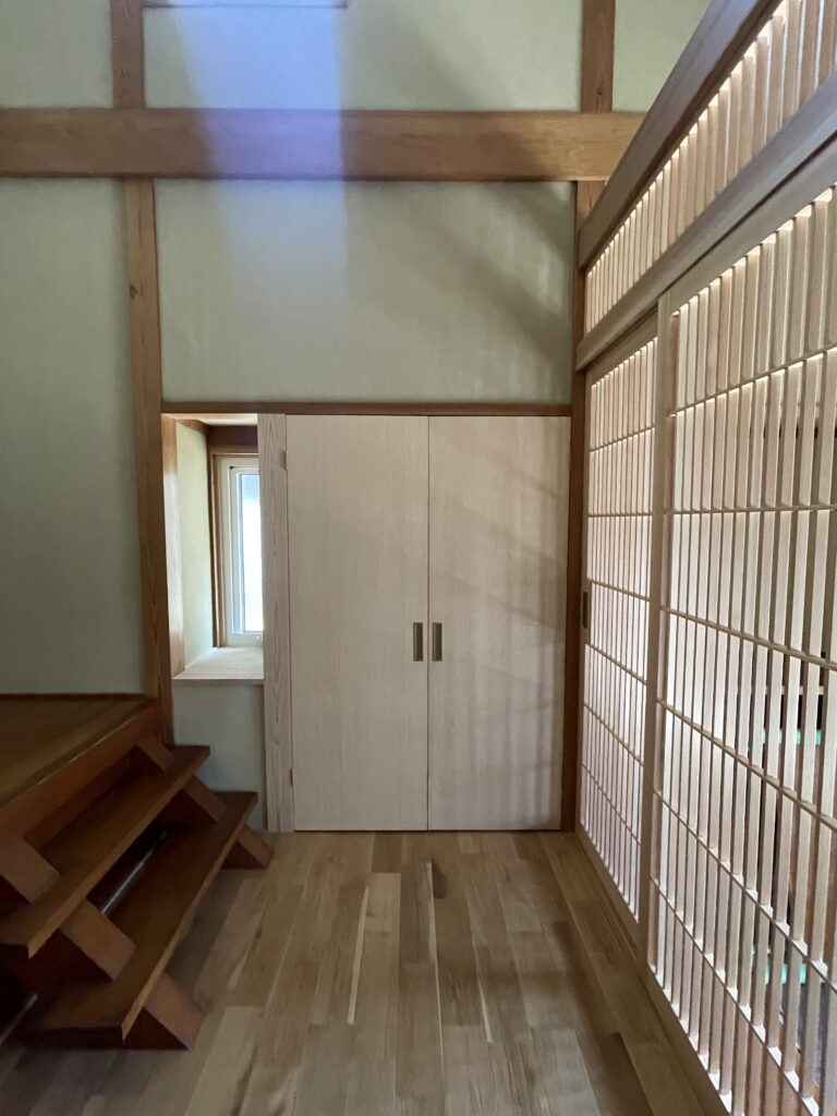 安芸郡府中町の日本家屋の性能向上リノベーションの現場は猫ちゃんと一緒に暮らすので建具や家具に工夫を加えています。