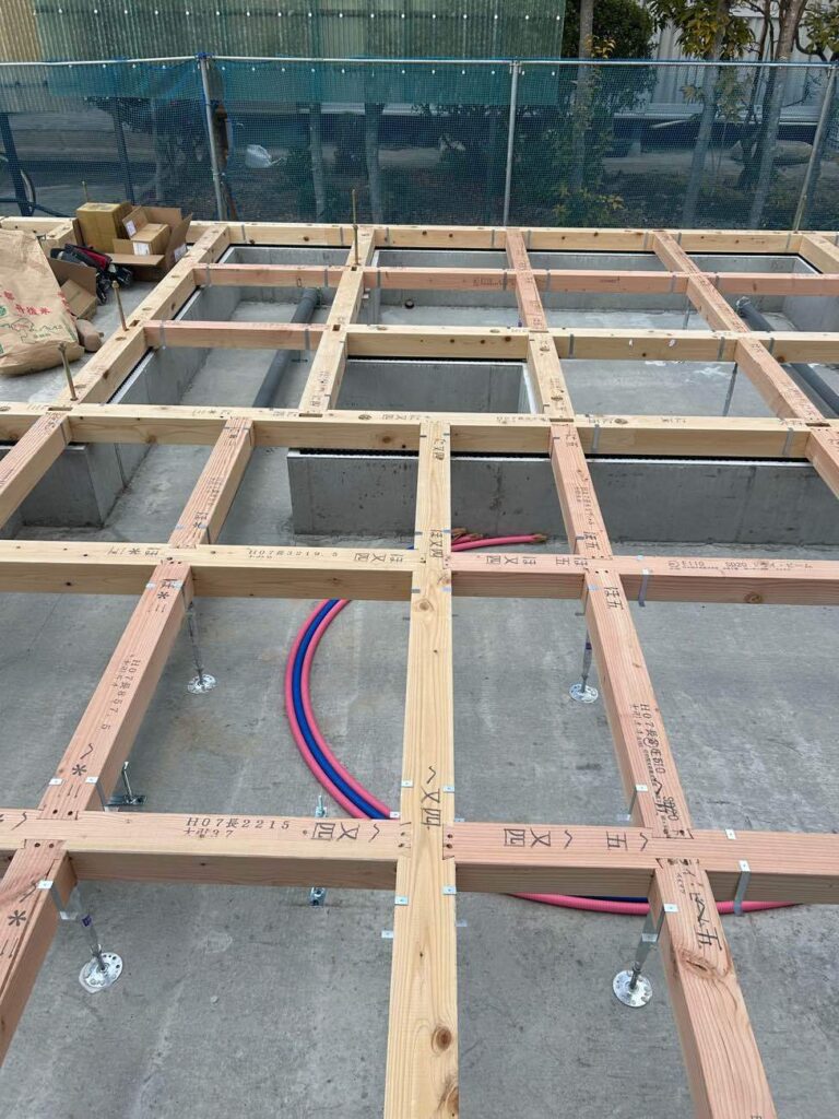 断熱材と大引き、土台とのジョイント部分には気密テープを貼って、その上から24㎜の合板を敷いて土台敷きは完了しました。