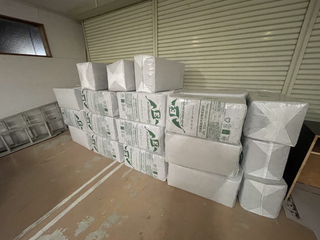 先日は事務所に、断熱材のセルロースファイバーが届いていました。
