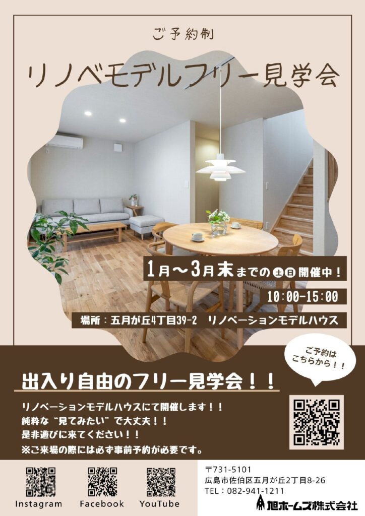 私たちの会社のある佐伯区五月が丘に中古住宅を改修して耐震性や断熱性能を大きく向上させた性能向上リノベーションのモデルハウスのご予約制の見学会を開催いたします。